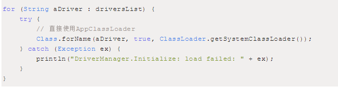线程上下文类加载器( ContextClassLoader)正好解决了这个问题。从名称上看,可能会误解为它是一种新的类加载器,实际上,它仅仅是Thread类的一个变量而已,可以通过 setContextClassLoader(ClassLoadercl)和 getContextClassLoader()来设置和获取该对象。如果不做任何的设置,Java应用的线程的上下文类加载器默认就是AppClassLoader。在核心类库使用SPI接口时,传递的类加载器使用线程上下文类加载器,就可以成功的加载到SPI实现的类。线程上下文类加载器在很多SPI的实现中都会用到。但在JDBC中,你可能会看到一种更直接的实现方式,比如,JDBC驱动管理 java.sql.Driver中的 loadInitialDrivers()方法中,你可以直接看到JDK是如何加载驱动的:
