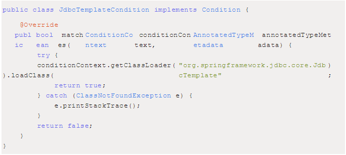 在Spring里可以很方便的编写你自己的条件类,所要做的就是实现 Condition接口,并覆盖它的 matches()方法。举个例子,下面的简单条件类表示只有在 Classpath里存在 JdbcTemplate类时才生效: