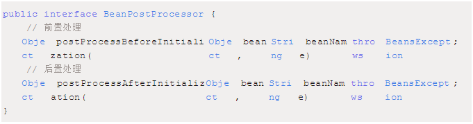 与之相似的,还有 BeanPostProcessor,其存在于对象实例化阶段。跟BeanFactoryPostProcessor类似,它会处理容器内所有符合条件并且已经实例化后的对象。简单的对比,BeanFactoryPostProcessor处理bean的定义,而BeanPostProcessor则处理bean完成实例化后的对象。BeanPostProcessor定义了两个接口: