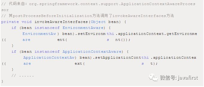 再来看一个更常见的例子,在Spring中经常能够看到各种各样的Aware接口,其作用就是在对象实例化完成以后将Aware接口定义中规定的依赖注入到当前实例中。比如最常见的 ApplicationContextAware接口,实现了这个接口的类都可以获取到一个ApplicationContext对象。当容器中每个对象的实例化过程走到BeanPostProcessor前置处理这一步时,容器会检测到之前注册到容器的ApplicationContextAwareProcessor,然后就会调用其postProcessBeforeInitialization()方法,检查并设置Aware相关依赖。看看代码吧,是不是很简单: