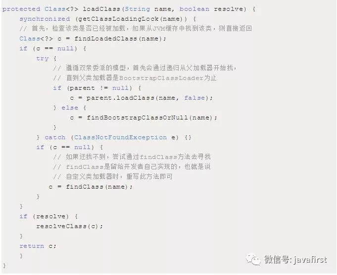 采用双亲委派模型的一个好处是保证使用不同类加载器最终得到的都是同一个对象,这样就可以保证Java 核心库的类型安全,比如,加载位于rt.jar包中的 java.lang.Object类,不管是哪个加载器加载这个类,最终都是委托给顶层的BootstrapClassLoader来加载的,这样就可以保证任何的类加载器最终得到的都是同样一个Object对象。查看ClassLoader的源码,对双亲委派模型会有更直观的认识: