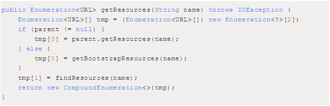 是不是觉得有点眼熟,不错,它的逻辑其实跟类加载的逻辑是一样的,首先判断父类加载器是否为空,不为空则委托父类加载器执行资源查找任务,直到BootstrapClassLoader,最后才轮到自己查找。而不同的类加载器负责扫描不同路径下的jar包,就如同加载class一样,最后会扫描所有的jar包,找到符合条件的资源文件。