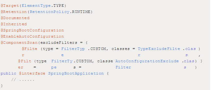其中 @SpringBootApplication开启组件扫描和自动配置,而 SpringApplication.run则负责启动引导应用程序。 @SpringBootApplication是一个复合 Annotation,它将三个有用的注解组合在一起: