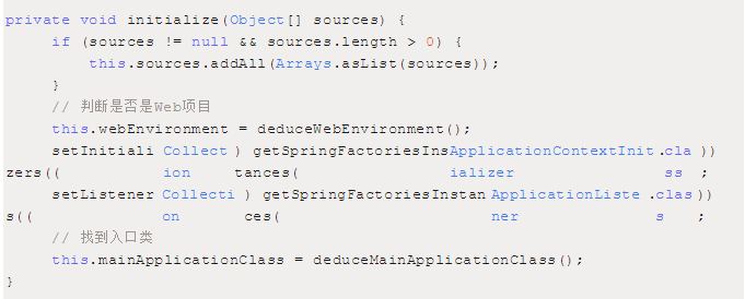 SpringBoot整个启动流程分为两个步骤:初始化一个SpringApplication对象、执行该对象的run方法。看下SpringApplication的初始化流程,SpringApplication的构造方法中调用initialize(Object[] sources)方法,其代码如下:
