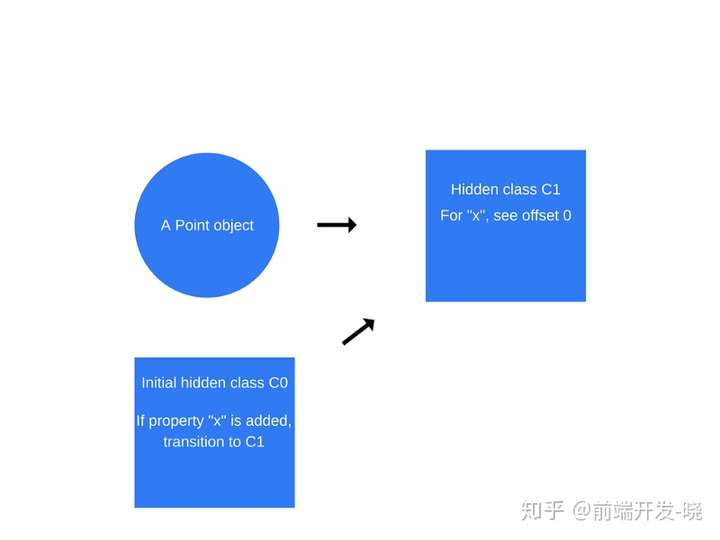 一旦“new Point(1, 2)”调用发生了,V8 将会创建一个叫做 “C0”的隐藏类。