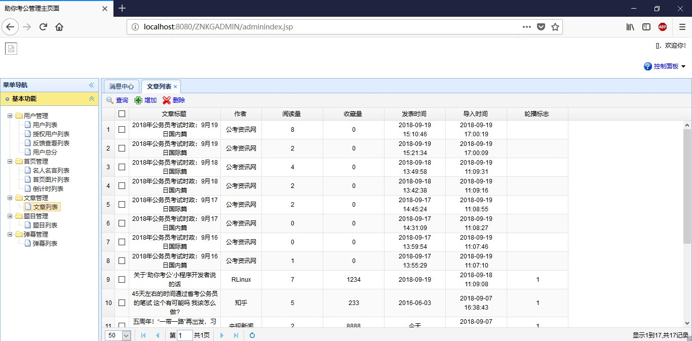当以上的一切都处理好之后,就相当于一篇文章新建成功了,؏؏☝ᖗ乛◡乛ᖘ☝؏؏。这时处理就应该是触发器了,写个定时,观察了网站的新闻发布时间,定个每天下午五点自动抓两篇文章国际和国内的。就很舒服。同时也留意到了,在17号那天是连发了两天的,16、17.16号是台风山竹,可能有影响到了,为此防止突发情况,自己也给后台留了个接口,人口输入html解析页面。还是很方便,就是输入网址就可以新增文章了,当然这个网址必须是‘公考资讯网’的。