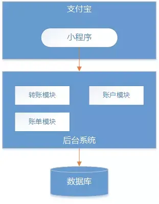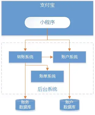 常见的集中式架构如下图所示,转账涉及的账户、转账、账单等功能模块都集中在一个后台系统中,所有的数据都在同一个数据库里面。在业务量不大的情况下,集中式后台系统设计简单,部署方便,没有太多复杂的场景。