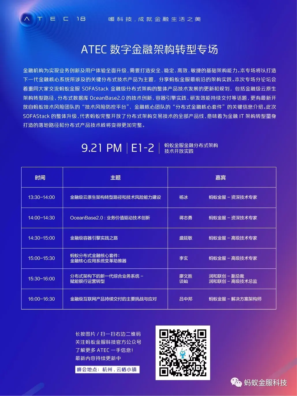 在这场论坛上,我们即将习得如何打造安全、稳定、高效、敏捷的基础架构能力,打造下一代金融核心系统所涉及的关键技术和架构,相关话题包括高可用架构、资损防控、智能运维、容器云、分布式核心等。