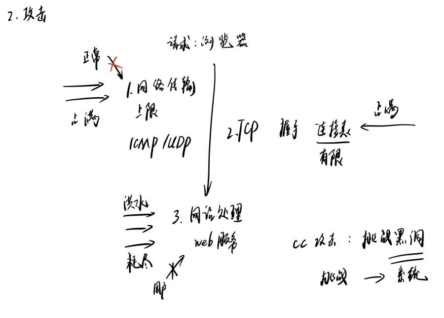 当一个请求从浏览器出发后,要经过网络传输,要与网站服务器建立TCP 连接,最后由网站WEB 服务进行处理,这里面各个环节,都可能被攻击。只要一个环节被攻破,就能使得整个流程跑不通,达到瘫痪服务的目的。