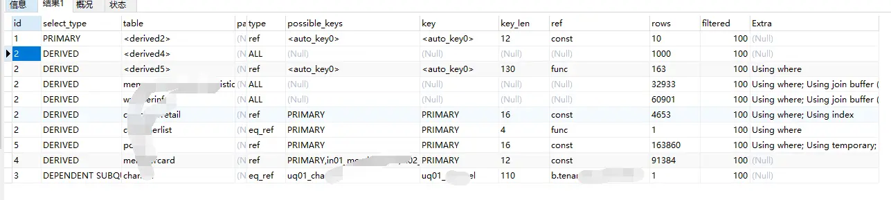 也是实在没办法了,才想到这个问题,但是我自己都觉得不大可能,而且语句本身也优化的差不多了,小结果集驱动大结果集,索引根据where条件创建等。毕竟就算MySQL升级也不会说改变SQL语法之类的,最多就是在优化SQL的进行了一些特殊处理,所以先查看一下SQL语句的索引执行情况于是desc sql语句查看,跟旧库上面差别