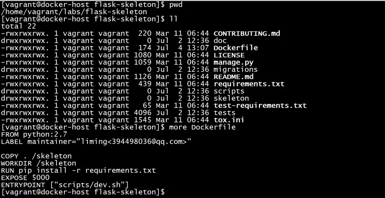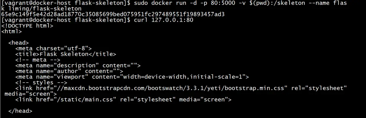 sudo docker run -d -p 80:5000 -v $(pwd):/skeleton --name flask liming/flask-skeleton