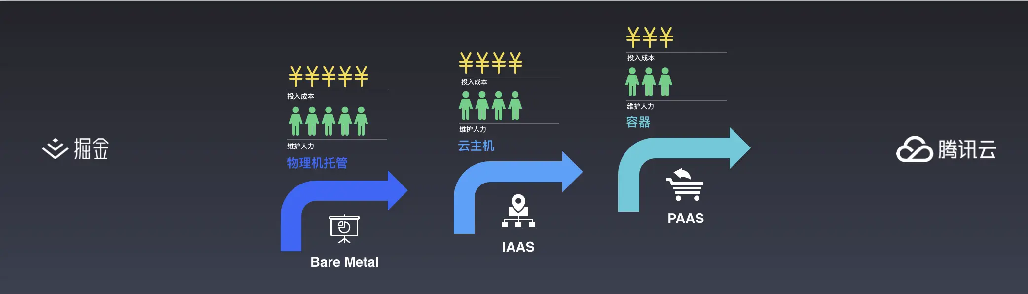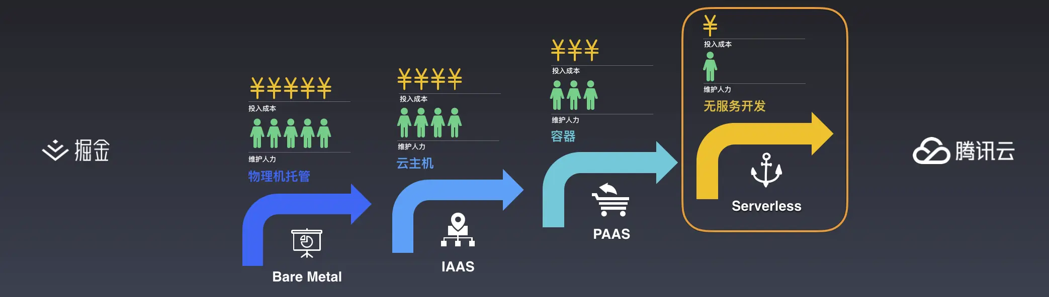 最开始当互联网还没有云服务商的时候,公司都得自己搭服务,不仅花大价钱买机器、买宽带流量,还得请人过来维护。如果在这种情况下要搞小程序开发,公司得请一个维护服务器硬件的、一个维护网络的,一个数据工程师,一个后台还有一个前端,刚好五个人。当云服务商开始进入变革整个市场的时候,我们就不用再自己维护硬件了,由云服务商来维护,因此我们可以少请一个维护硬件的,但还是得有一个运维去维护云服务。当云服务商将数据库、容器服务都抽象出来上云之后,咱们连专业的数据库维护都可以不请了,由后台或者云维兼岗就行。云服务商的不断发展,确实是让云服务的成本不断下降,但投入的钱还是很多呀,要投入的人还是不少,这几年生意难做,作为老板肯定是想投入成本、试错成本越少越好。