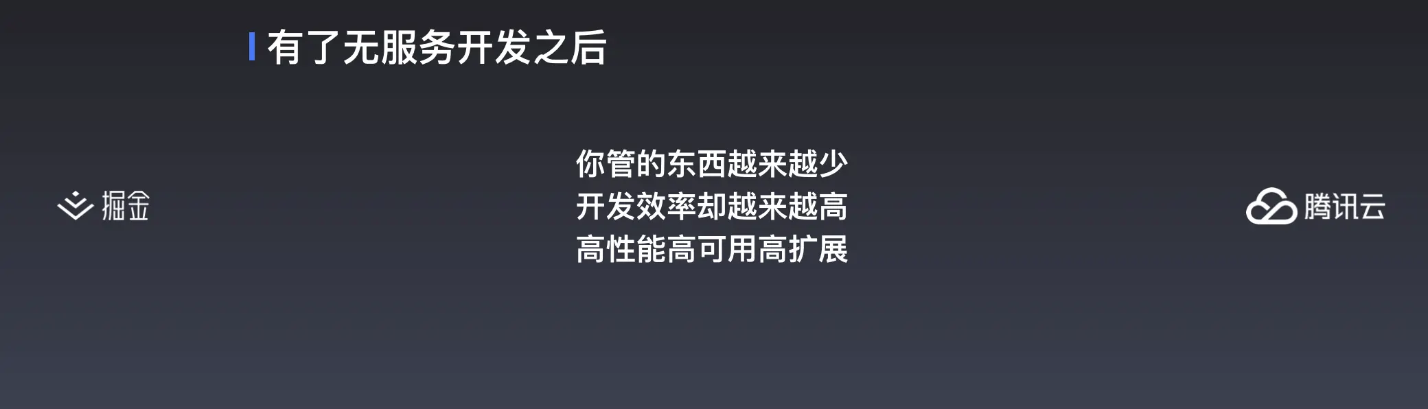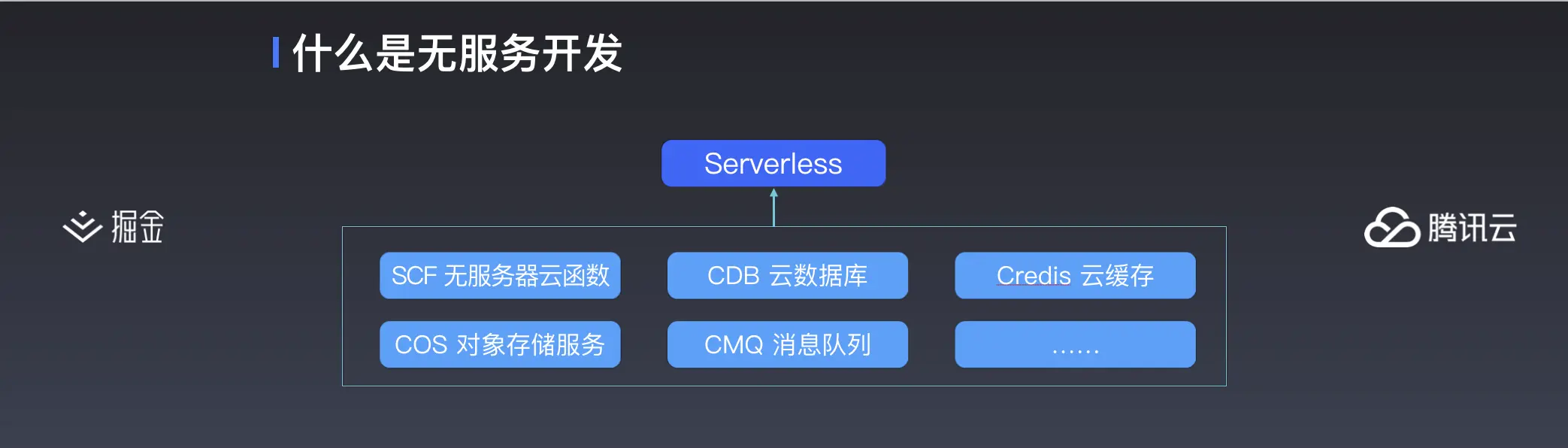 那什么是无服务开发呢?无服务,又称为 Serverless。Serverless 还处在一个比较初期的阶段,目前也没有权威和官方的定义,不同人不同公司有不同说法,今天我也不打算讲太复杂。顾名思义, Serverless 就是指应用的开发不再需要考虑服务器这样的硬件基础设施,基于 Serverless 架构的应用主要依赖于像腾讯云这样的云服务商提供的后台服务。比如说无服务云函数、云数据库、对象存储服务等等。简单来说,相当于你现在要开个水果店卖水果,以前你还得要租店面,搞水电、装修门面。现在这些都不用了,你就在一个已经搭好各种各样设施的超市里,租一个已经帮你搞好门面的架子或者箱子,卖得好你就租大一点,卖不好就租小一点,随时随地随你的心意,非常灵活。