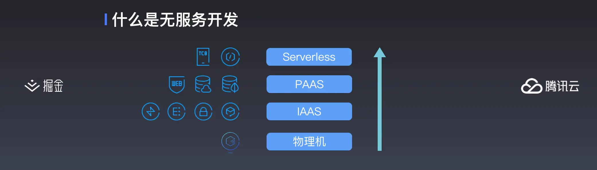 为什么说无服务化开发是趋势呢?因为云服务的进程,已经从物理机,演进到 IAAS,再到 PAAS。IAAS 就是包括像云虚拟机、私有网络、网络专线、负载均衡等等的基础服务;PAAS 则更抽象一些,比如像云数据库、网络防护等等。基于 IAAS、PAAS,云服务商发展出 Serverless 这类更高级的开发服务。因此呢,无服务开发就会是今后开发类似小程序这类轻量应用的新的开发趋势。