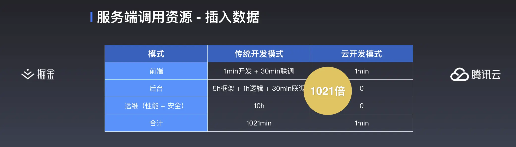 假设开发者是一个菜鸟,对比下来,传统的开发模式,前端要花31分钟进行开发与联调,后台要用6小时部署服务开发逻辑还要30分钟联调,而运维的话从学习到会用大概也得10小时,基本上是云开发模式耗时的1000多倍。