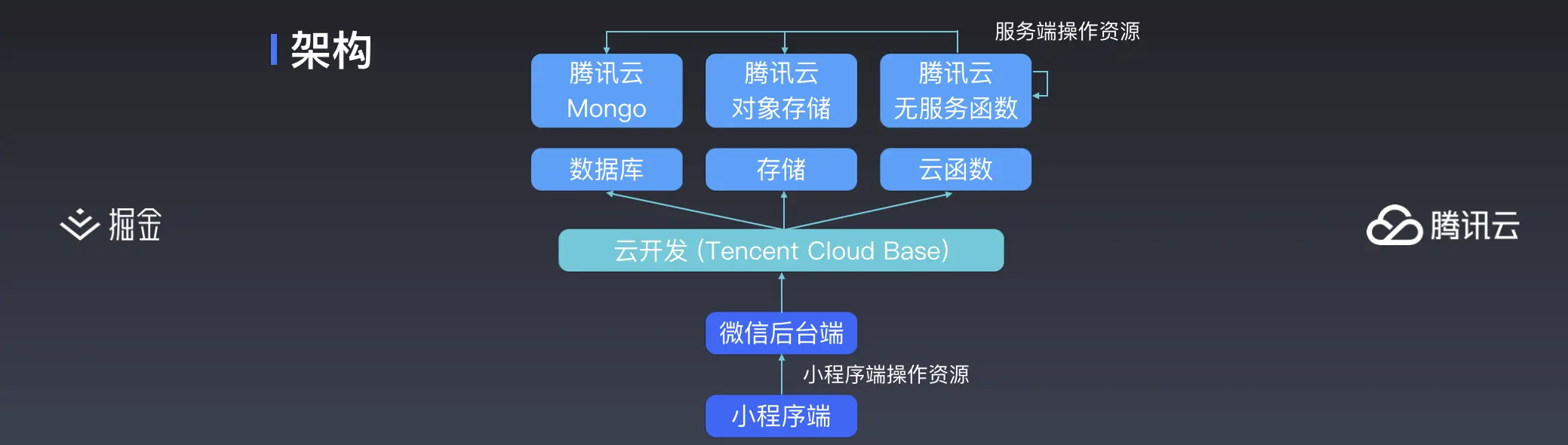 在小程序端操作资源方面,我们是使用小程序的原生接口进行操作,而在小程序端操作资源,由于安全的考虑问题,基本上操作存储、数据库等的资源只能写用户自己的数据,而读数据则根据规则来判断是否有权限。在服务端操作资源方面,我们使用 wx-server-sdk 或者 tcb-admin-node 来处理,前者是基于后者的能力进行了封装。在服务端使用这两个 SDK 去操作资源,所拥有的权限是管理级的,就是意味着可以操作一切的资源。