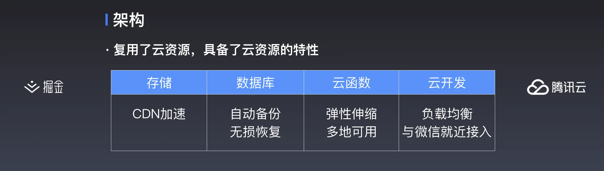 另外,既然是复用了腾讯云的基础资源,那自然是具备了云资源的特性。比如存储自动接入了 CDN 加速, 数据库天然就带有自动备份、无损恢复等功能,云函数有弹性伸缩、多地可用的特性,能响应峰值不同的服务。而云开发服务层,我们也做了负载均衡、并且与微信后台进行就近接入,让性能更好。