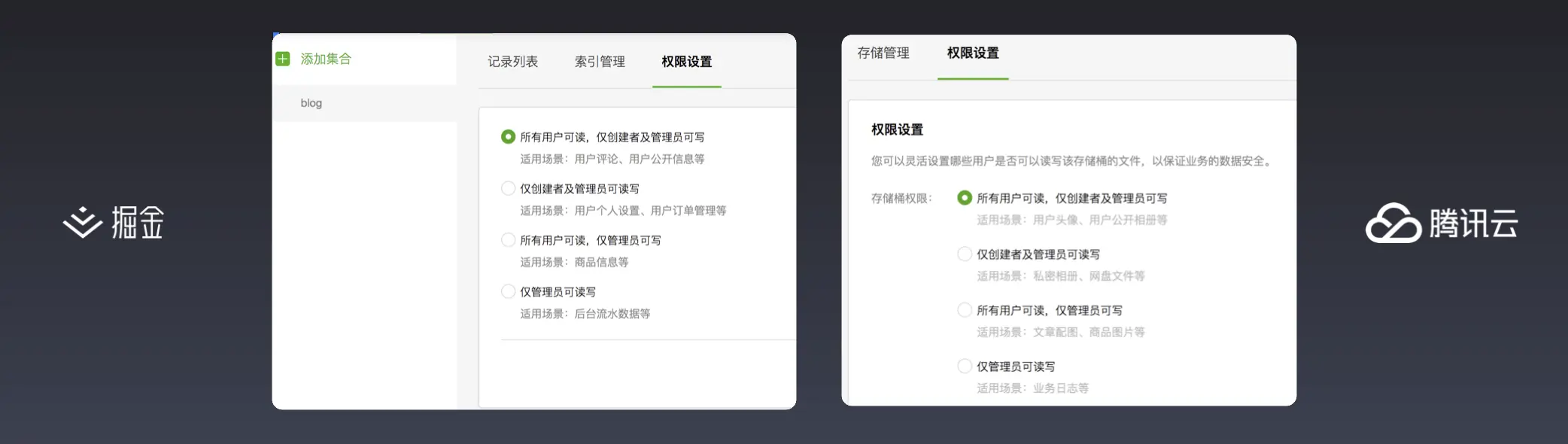 左边的图是数据库的权限控制,右边的图是存储的权限控制。这两个控制面板都有各自不同权限的一些推荐的使用场景,大家可以打开控制去读下面每个权限的灰色的解释。