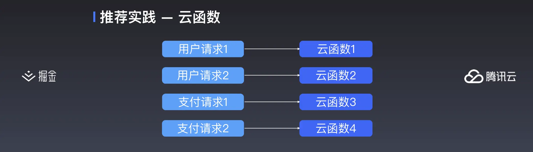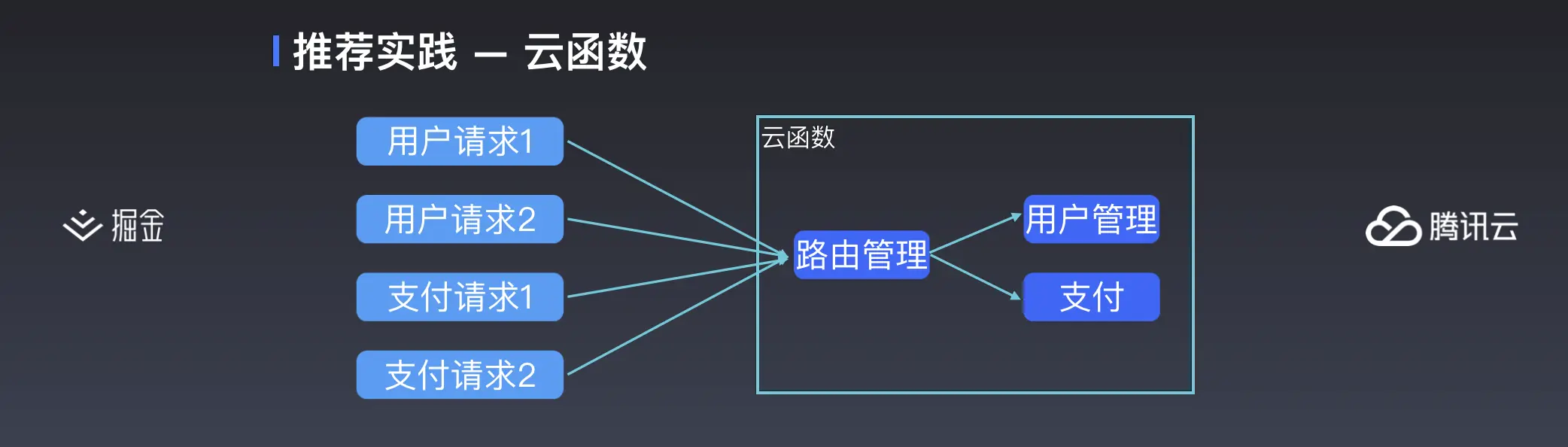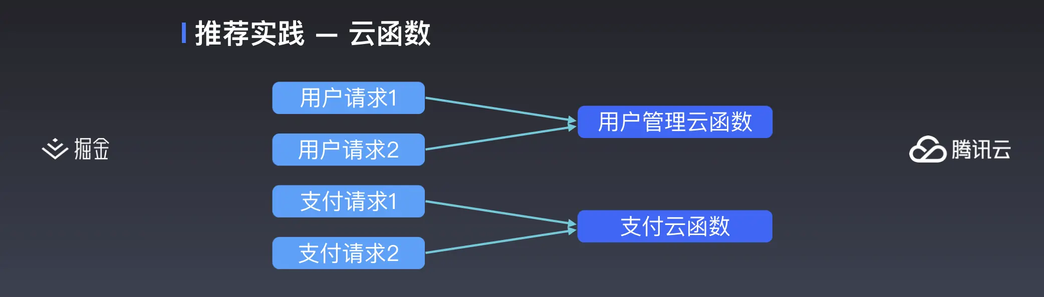 第二幅架构图就是尝试将请求归类,一个云函数处理某一类的请求,比如有专门负责处理用户的,或者专门处理支付的云函数。