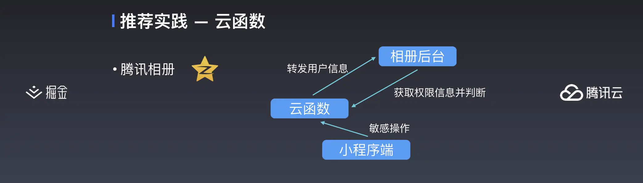 云函数还有一种用法就是,可以作为中间路由,然后将 appid, openid,转发给原有的服务。这里以腾讯相册为例。具体怎么操作呢。比如腾讯相册之前将评论功能接入了云开发,但一些敏感操作,像删除、编辑评论,这个请求发送到云函数,然后云函数会将用户信息转发给相册原本的后台,然后再将该用户是否有权限返回来告诉云函数,如果有权限,就在云函数里删除评论。