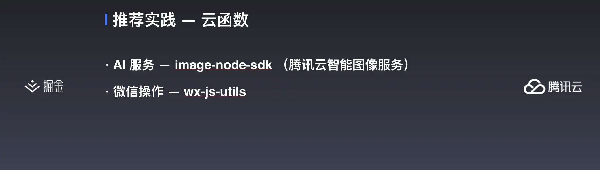 最后,如果你们想在云函数调用 AI 服务,还有一些微信相关的操作,可以使用我封装的这两个 SDK。第一个 image-node-sdk 覆盖面比较全,覆盖了全部的腾讯云智能图像服务,下面的 wx-js-utils,也提供了微信支付、模板消息、用户信息获取等几个常用的接口。
