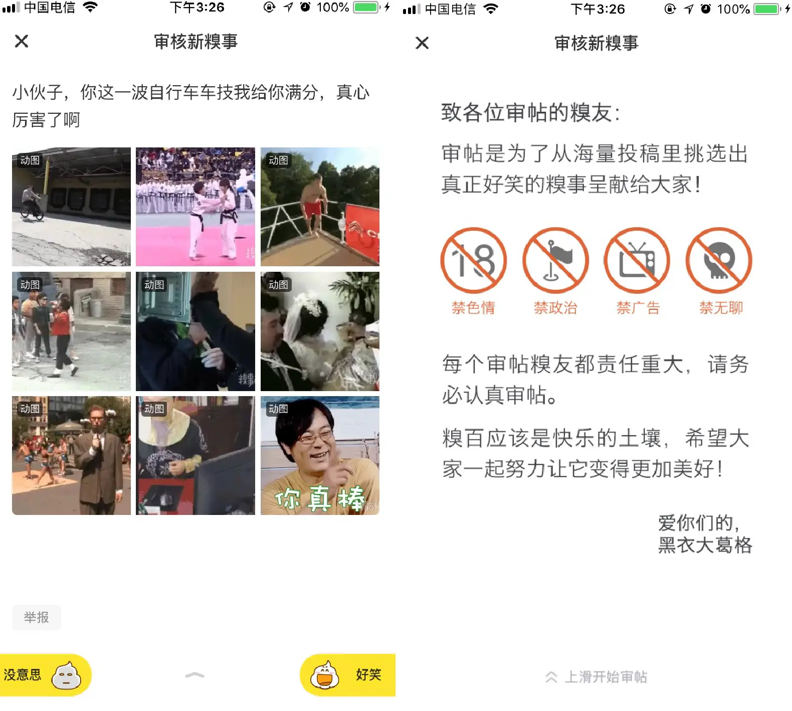 随着「糗事百科」用户量激增,越来越多的用户参与到搞笑 UGC 内容的制作与传播过程中,平台内容质量的审核与把关成为一大难题。「糗事百科」采用了一套综合了用户审核、机器审核这样双重的内容审核机制,形成了以优质内容拉动用户增长的良性循环。仅 2012 年 1 年时间「糗百」即完成了移动端用户从 0 到 1000 万的突破并实现盈利。