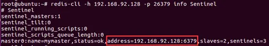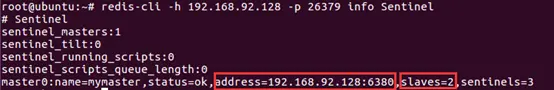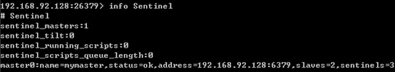 按照上述方式配置和启动之后,整个哨兵系统就启动完毕了。可以通过redis-cli连接哨兵节点进行验证,如下图所示:可以看出26379哨兵节点已经在监控mymaster主节点(即192.168.92.128:6379),并发现了其2个从节点和另外2个哨兵节点。