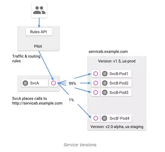 要介绍 istio 请求路由,我们不由得先从 pilot 和 envoy 开始谈起。 在服务网格中,Pilot 管理和配置所有的 envoy 实例。在 pilot 中,你几乎可以配置所有的关于流量导向规则及其他故障恢复规则。而 Envoy 不仅会获得从 pilot 拿到的基本负载均衡信息,同时周期性的健康检查,也会告诉所有的 envoy 其他的实例现在的运行状况。负载均衡信息,及健康检查的信息可以使 envoy 更加智能的去分发流量。