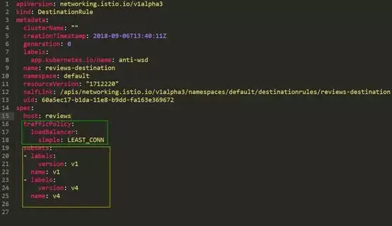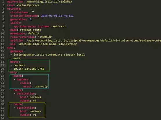 中间标红的是规则所在的 namespace,而不是 reviews 所在的 namespace。第二条则是配置给 reviews 组件的通过负载均衡访问的地址。黄色部分则是路由地址,其中的 subset 对应的是服务中的版本。