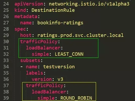 如图所示,绿色的内容是针对服务层面设置的负载均衡方式,如果请求了 ratings 这个服务那么默认将会采用最小连接数这个负载均衡方式,如果请求访问这个服务需要的是v3版本这时候版本级的负载均衡方式将会覆盖服务级的负载均衡方式,这时则会使用 ROUND_ROBIN 的方式。不同层级的负载均衡设置可以让操作者更加细化自身的服务设计。