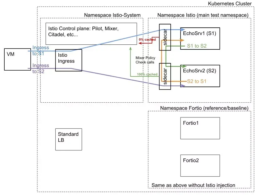 为了更好的跟踪Istio的性能问题,Istio提供了一个专门用于Isito性能测试的测试工具——Fortio。你可以通过kubernetes集群,轻而易举的将Forito部署起来,测试工具的安装链接如下: github.com/istio/istio… 下图是测试工具的组织结构图,其中上半部分为Istio服务网格管理的两个服务S1与S2,其中S1服务关掉了mixer上报功能(mixer遥测功能实现方案一直备受争议,业界普遍认为sidecar向mixer上报遥测数据一定程度上损害了sidecar的请求转发能力),请求通过ingressgateway流入系统,再经由sidecar分发到各个服务,是典型的Istio服务访问方式。下半部分为经典的kubernetes集群中的服务访问方式,请求经由k8s的proxy的转发,负载均衡到各个pod。两者的对比也就展示了Istio访问模式与经典模式相比,性能方面的损耗,下面介绍一下Fortio的几个功能点: