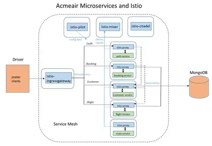 Acmeair(又名BluePerf)是一个用Java实现的类似客户的微服务应用程序。此应用程序在WebSphere Liberty上运行,并模拟虚拟航空公司的运营。 Acmeair由以下微服务组成: a) Flight Service检索航班路线数据。预订服务会调用它来检查奖励操作的里程(Acmeair客户忠诚度计划)。 b) 客户服务存储,更新和检索客户数据。它由Auth服务用于登录和预订服务用于奖励操作。 c) 预订服务存储,更新和检索预订数据。 d) 如果用户/密码有效,Auth服务会生成JWT。 e) 主服务主要包括与其他服务交互的表示层(网页)。这允许用户通过浏览器直接与应用程序交互,但在负载测试期间不会执行此操作。