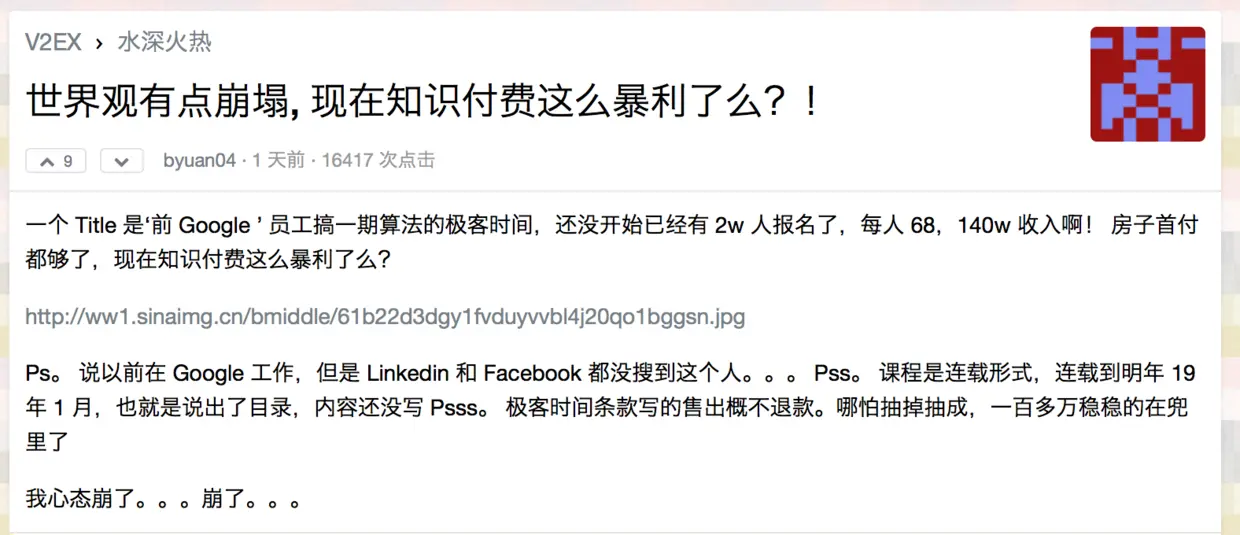 昨天 V2EX(一个大量程序员聚集的社区)上出现了一篇帖子,大意就是有一位头衔为 “前 Google 工程师” 的人,靠知识付费,赚了很多钱,发帖的人觉得自己 “心态崩了”。