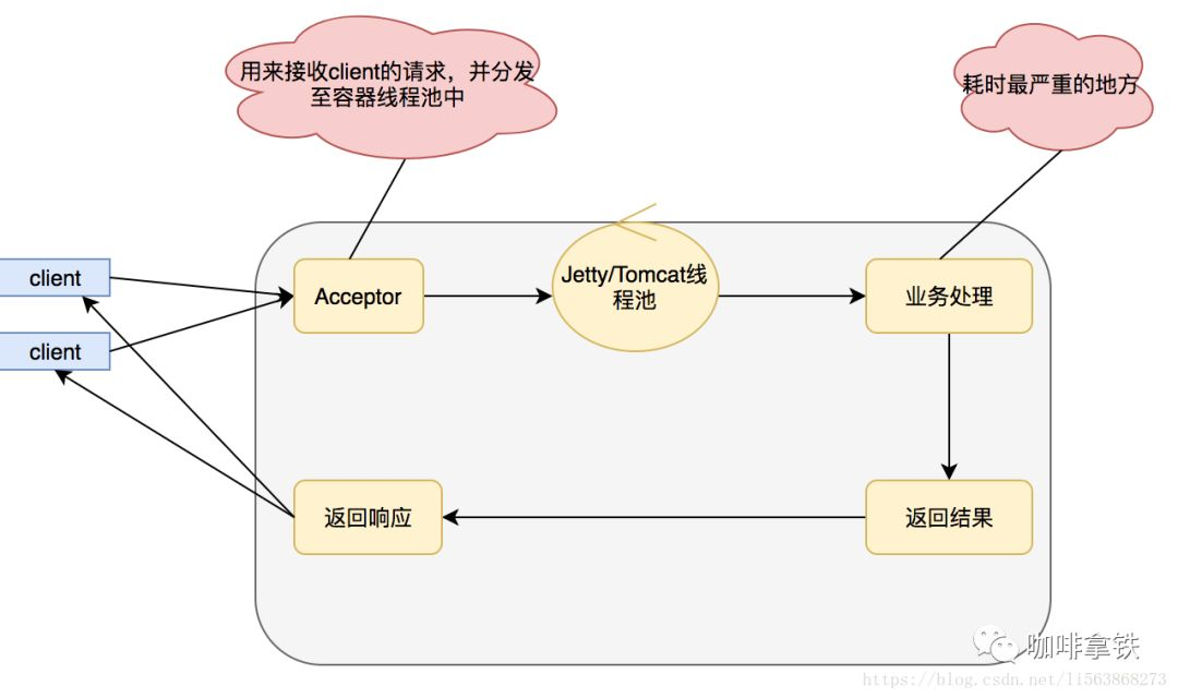 缺点在于,业务逻辑线程和servlet容器线程是同一个,一般的业务逻辑总得发生点IO,比如查询数据库,比如产生RPC调用,这个时候就会发生阻塞,而我们的servlet容器线程肯定是有限的,当servlet容器线程都被阻塞的时候我们的服务这个时候就会发生拒绝访问,线程不然我当然们可以通过增加机器的一系列手段来解决这个问题,但是俗话说得好靠人不如靠自己,靠别人替我分担请求,还不如我自己搞定。所以在servlet3.0之后支持了异步化,我们采用异步化之后就会变成如下: