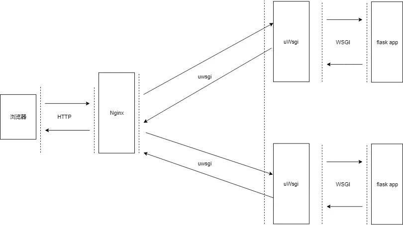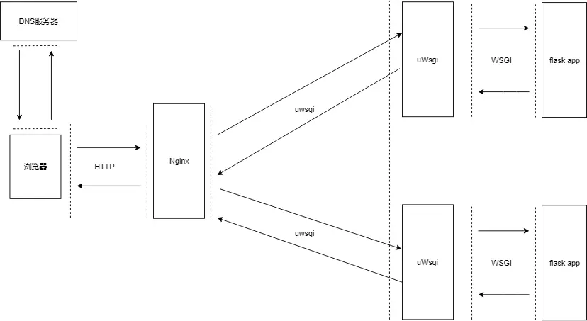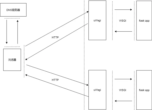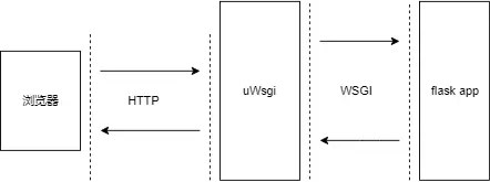 uWsgi是web服务器,浏览器发起HTTP请求,web服务器接收请求后,会根据WSGI协议调用flask框架实现的web应用程序处理请求,flask app处理完毕后把结果反馈回uWsgi web服务器,web服务器对浏览器进行HTTP应答。