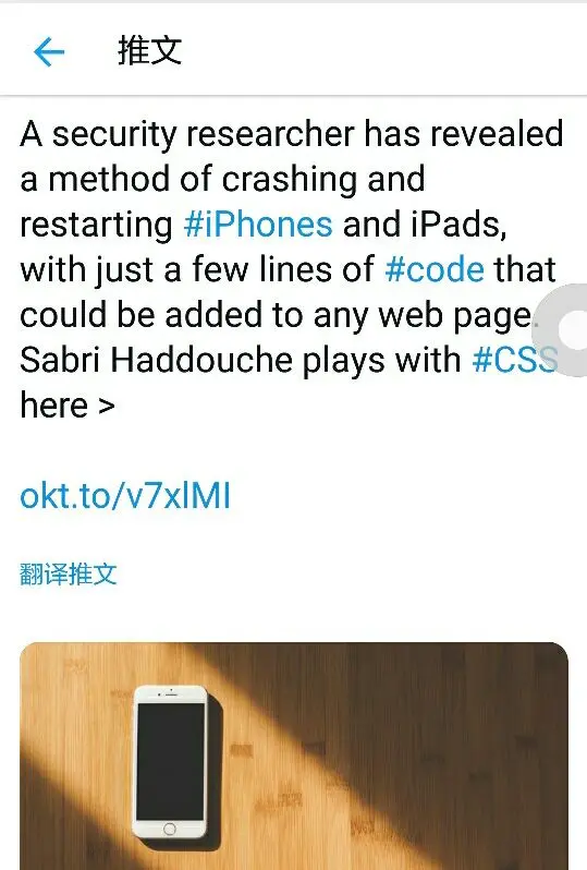 逛推特时发现一个有趣的新闻,Sabri Haddouche发现Safari使用的WebKit渲染引擎中存在一个漏洞,该漏洞会令使用IOS操作系统的iPhone和iPad系统崩溃并重新启动。 以下是源链接