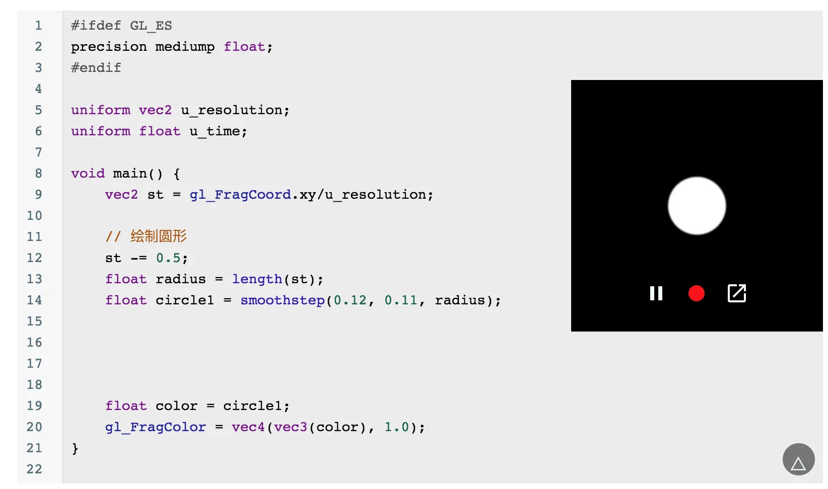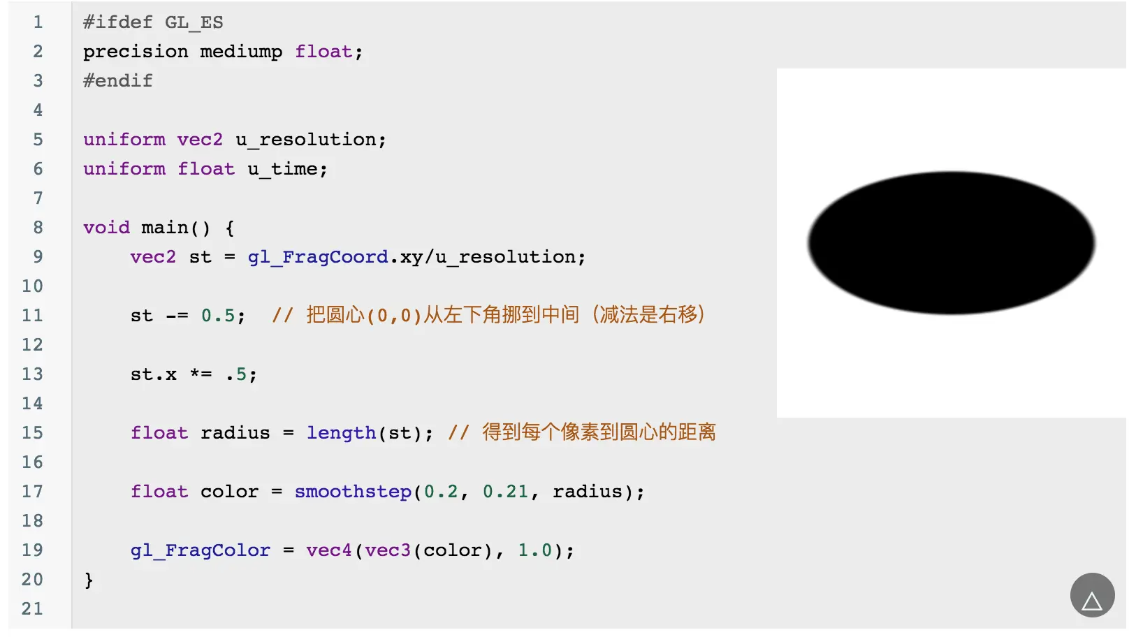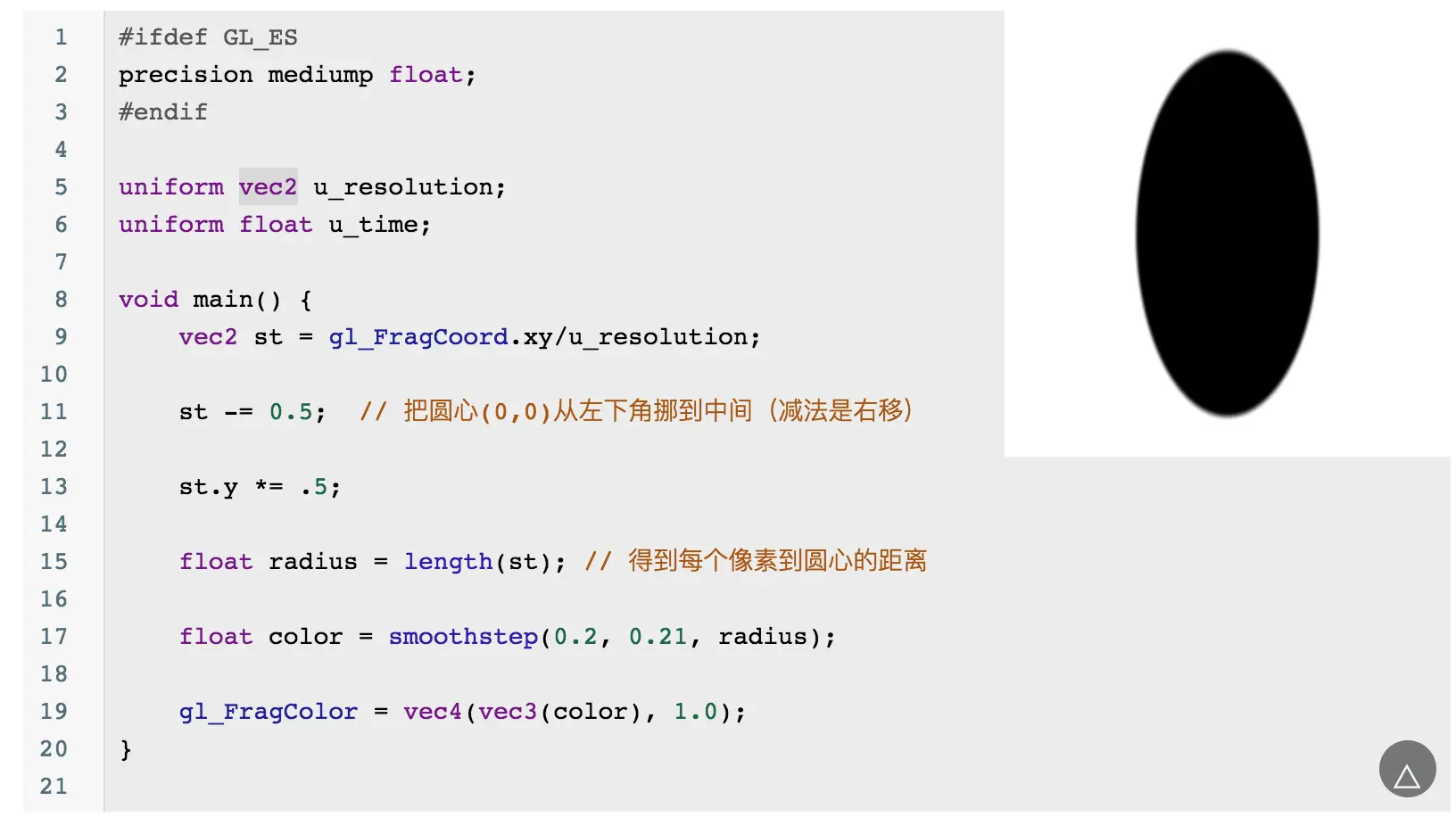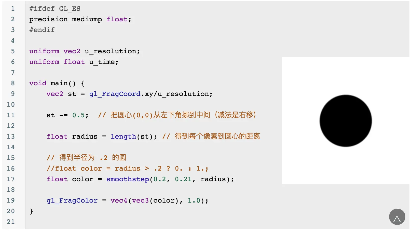 当然你会发现这个圆的边缘有锯齿,可以通过 smoothstep 来优化边缘问题: