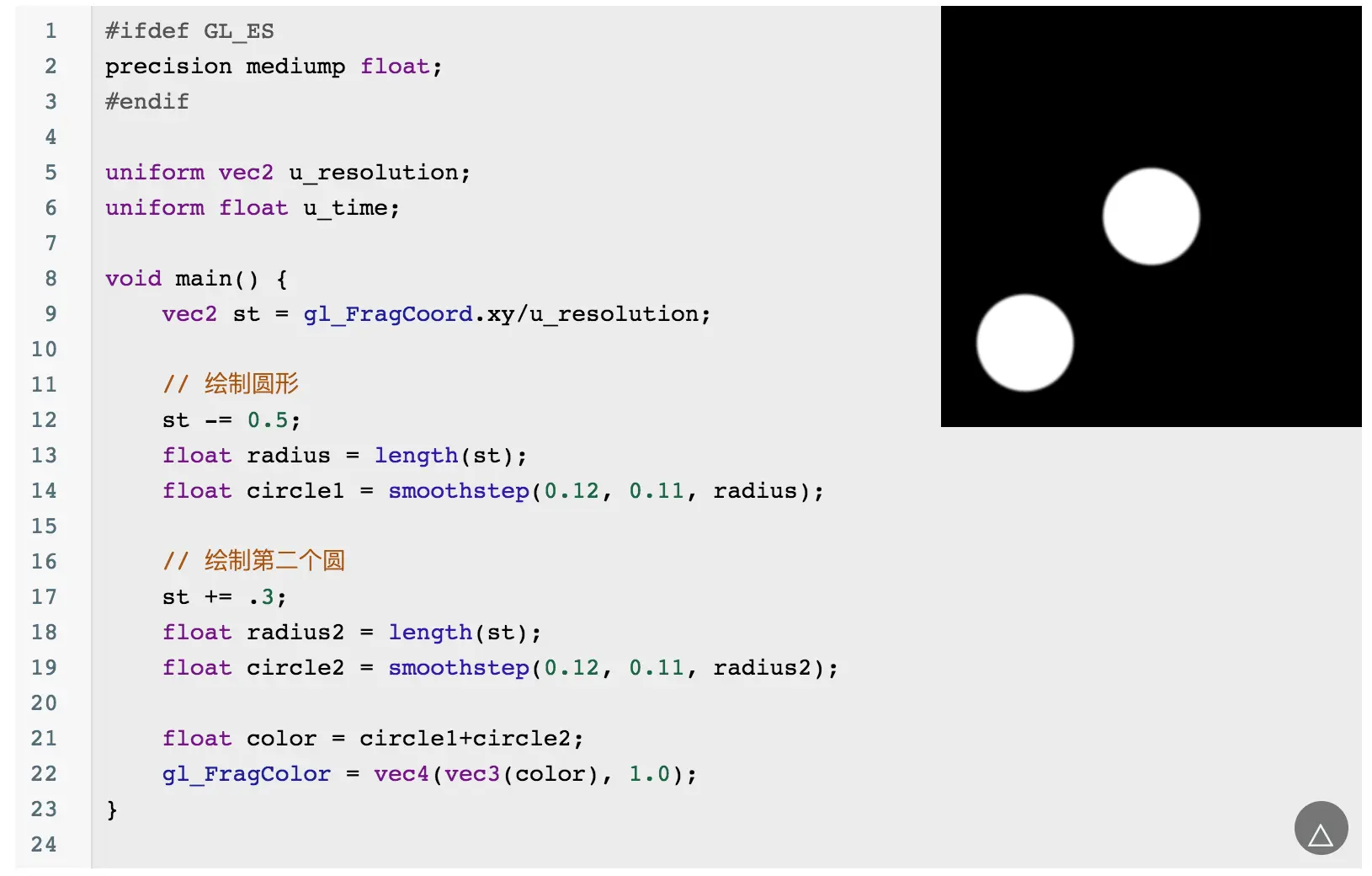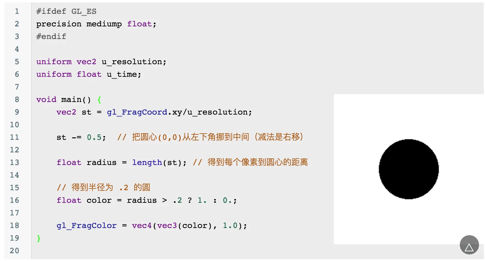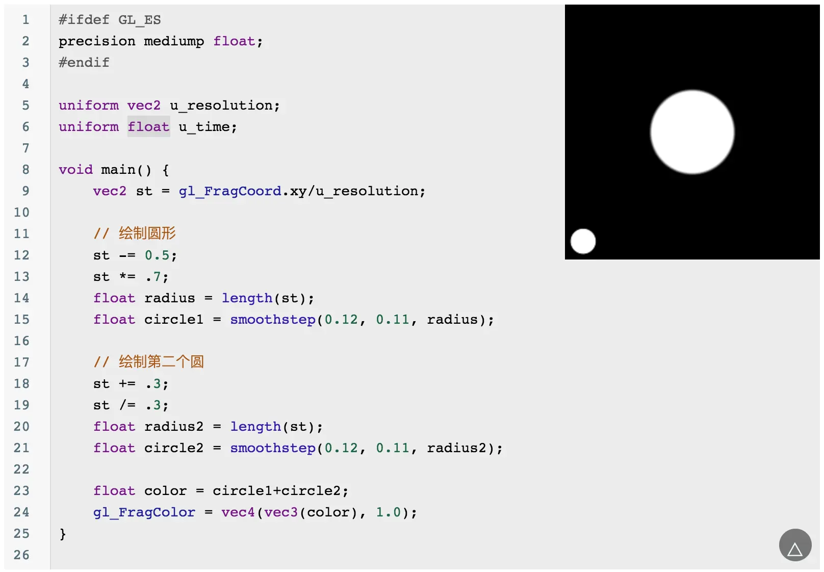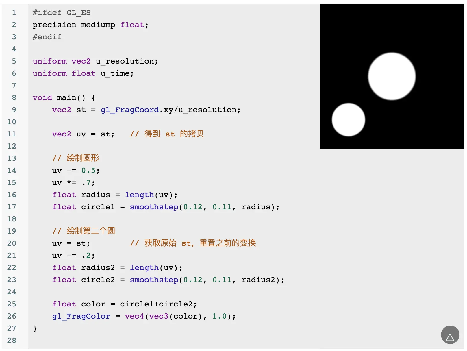 当然你会发现这个圆的边缘有锯齿,可以通过 smoothstep 来优化边缘问题: