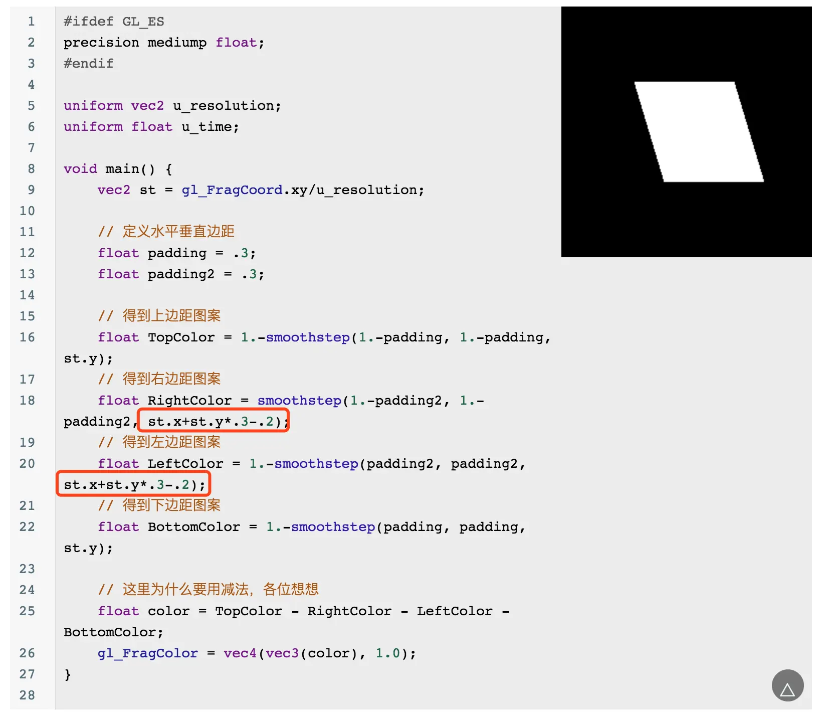 原本我们只单独使用 st.x 或 st.y,那么它们只代表一条垂直 x 或 有轴的直线。而通过st.x + st.y引入了两个变量,得到了一条二元线性方程,并能产生斜边。之所以*0.3-0.2是为了调整倾斜角度和调整倾斜面积。
