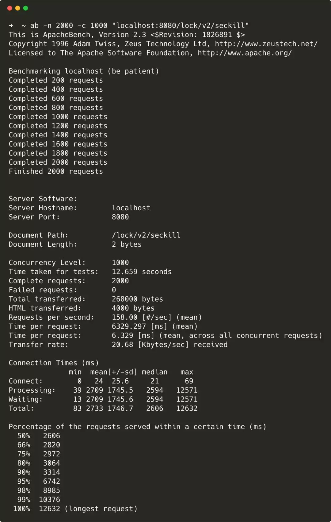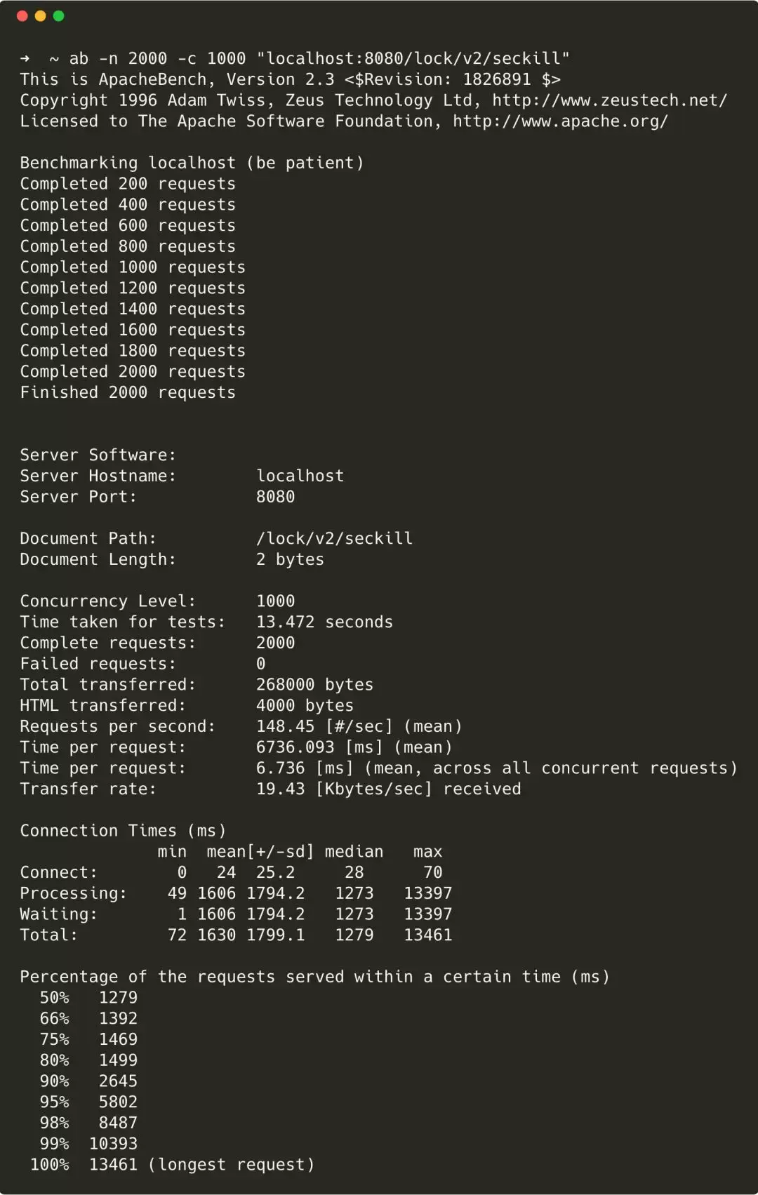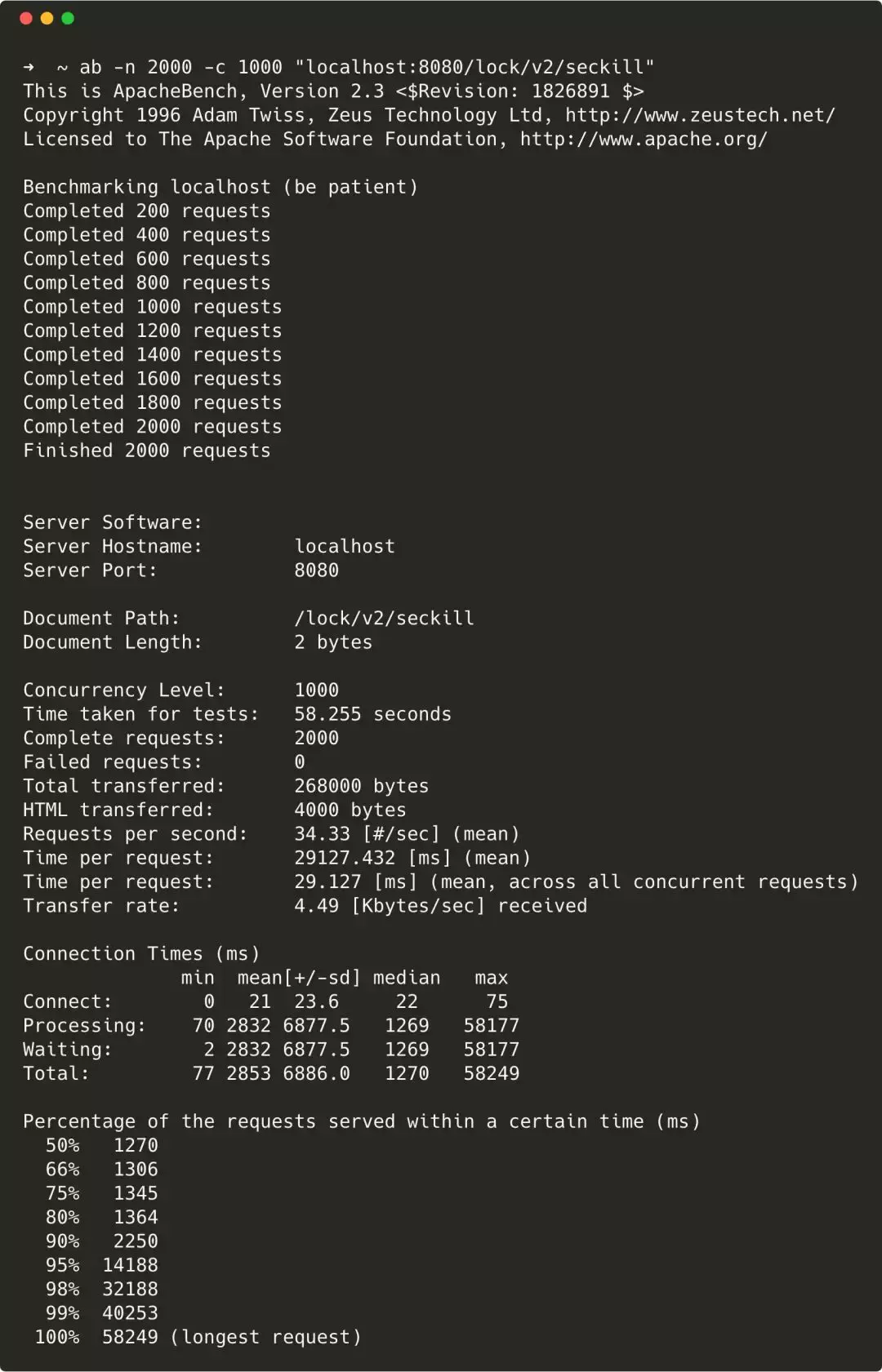 ab -n 2000 -c 1000 "localhost:8080/lock/v2/seckill"