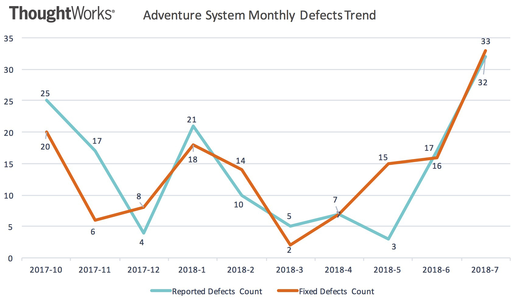 除了分析线上问题,我还对从2017年10月-2018年7月QA提交的Defects情况做了一个统计,观察每个月提交的Defects和修复的Defects情况。