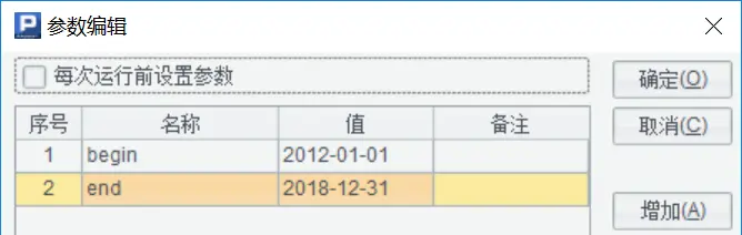 | 2 | =A1.query(“select min( 订单 ID) 最小 ID,max(订单 ID) 最大 ID from 订单 where 订购日期 >=? and 订购日期 <=?”,begin,end) | =b=A2. 最小 ID | =e=A2. 最大 ID |