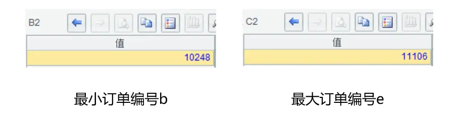 2、B2-C2 将最小订单号和最大订单号分别赋值给变量 b 和 e