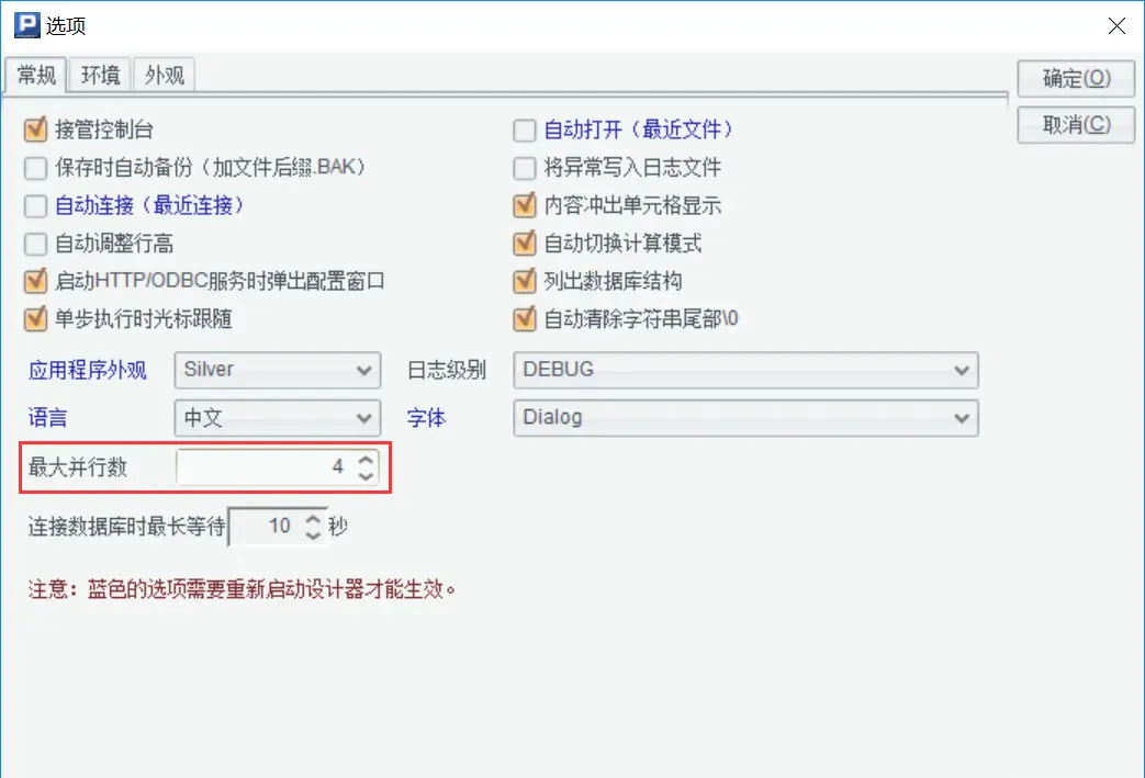 通过集算器进行并行取数前需要配置集算器的并行属性。IDE 中通过菜单“工具 - 选项”设置 IDE 支持的最大并行数量,一般建议最大并行数不要超过 CPU 核数。