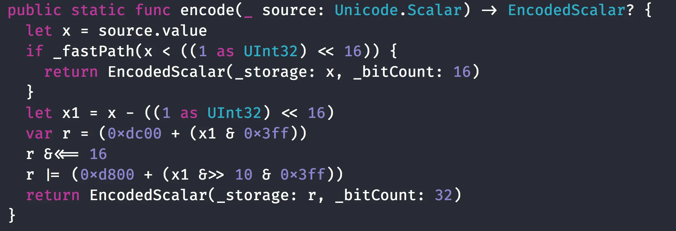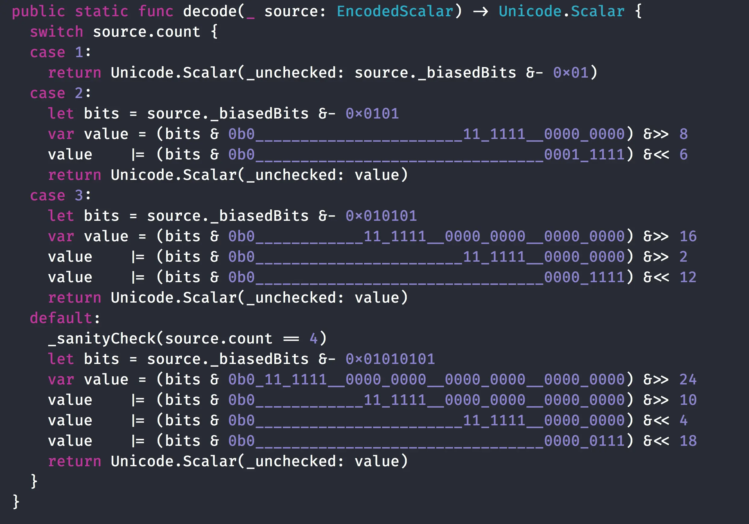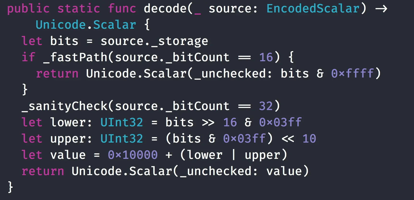 根据UTF-16的编码规则,同理可以得到解码规则,下图是从Swift源码中截取的UTF-16的解码代码: [image:69D26150-1CDC-4E9D-B94E-916136C27353-55654-0002535098FC388A/46208888-62B3-4137-95AE-A697AFD5B43A.png]