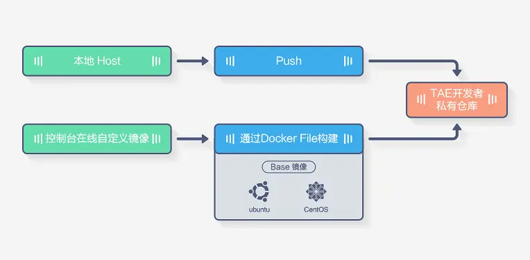 自定义镜像: 如果官方提供的镜像不能满足需求,TAE还支持开发者构建自定义Docker镜像,通过自定义Docker镜像开发者可以创建高度个性化的服务,比如各类语言的运行环境(如:ruby、go、node.js等)、各类服务器软件Apache、Lighttpd等等。TAE支持两种构建自定义镜像方式:在线制作自定义镜像、本地制作镜像制作并提交TAE私有仓库。