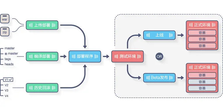 发布新版本的程序时,可以选择正式环境中的部分实例进行发布,而其它实例保留运行老版本程序,新版本运行一段时间无异常后,再全部上线,以确保发布稳定 。