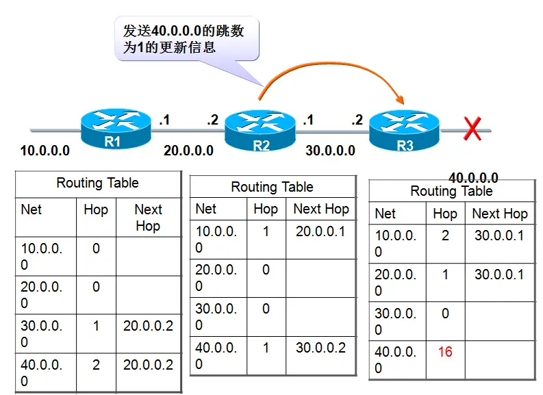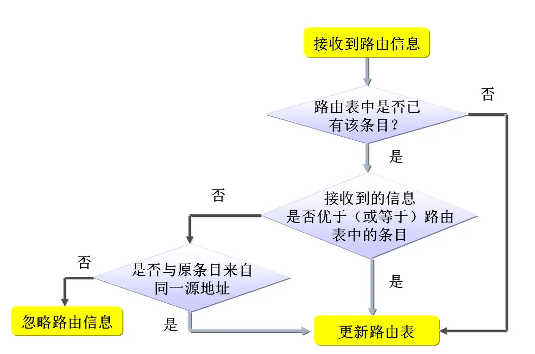 RIP路由协议向邻居发送整个路由表信息,RIP路由协议以跳数作为度量值根据跳数的多少来选择最佳路由,最大跳数为15跳,16跳为不可达,经过一系列路由更新,网络中的每个路由器都具有一张完整的路由表的过程,称为收敛。