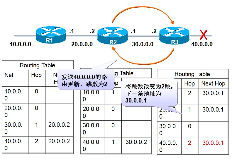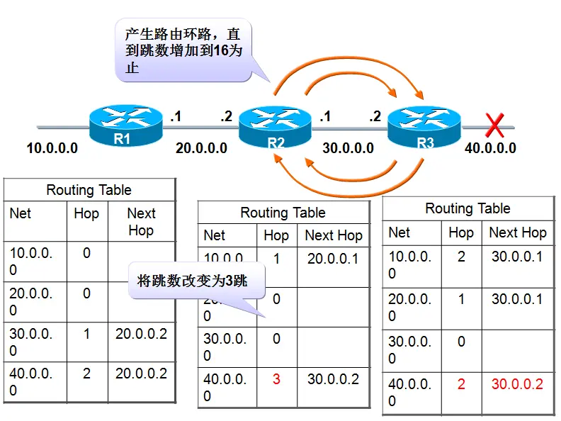 RIP因为矢量路由协议本身的算法缺陷,很容易导致路由环路。比如说由器A会将针对目标网络C的路由表项的metric值置为16,即标记为目标网络不可达,并准备在每30秒进行一次的路由表更新中发送出去,如果在这条信息还未发出的时候,A路由器收到了来自B的路由更新报文,而路由器B中包含着关于网络C的metric为2的路由信息,根据前面提到的路由更新方法,路由器A会错误的认为有一条通过路由器B的路径可以到达目标网络C,从而更新其路由表,将对于目标网络C的路由表项的metric值由16改为3,而对于的端口变为与路由器B相连接的端口。很明显,路由器A会将该条信息发给路由器B,路由器B将无条件更新其路由表,将metric改为4;该条信息又从路由器 B发向路由器A,路由器A将metric改为 5,最后双发的路由表关于目标网络C的metric值都变为16,此时,才真正得到了正确的路由信息。这种现象称为”计数到无穷大”现象,虽然最终完成了收敛,但是收敛速度很慢,而且浪费了网络资源来发送这些循环的分组。