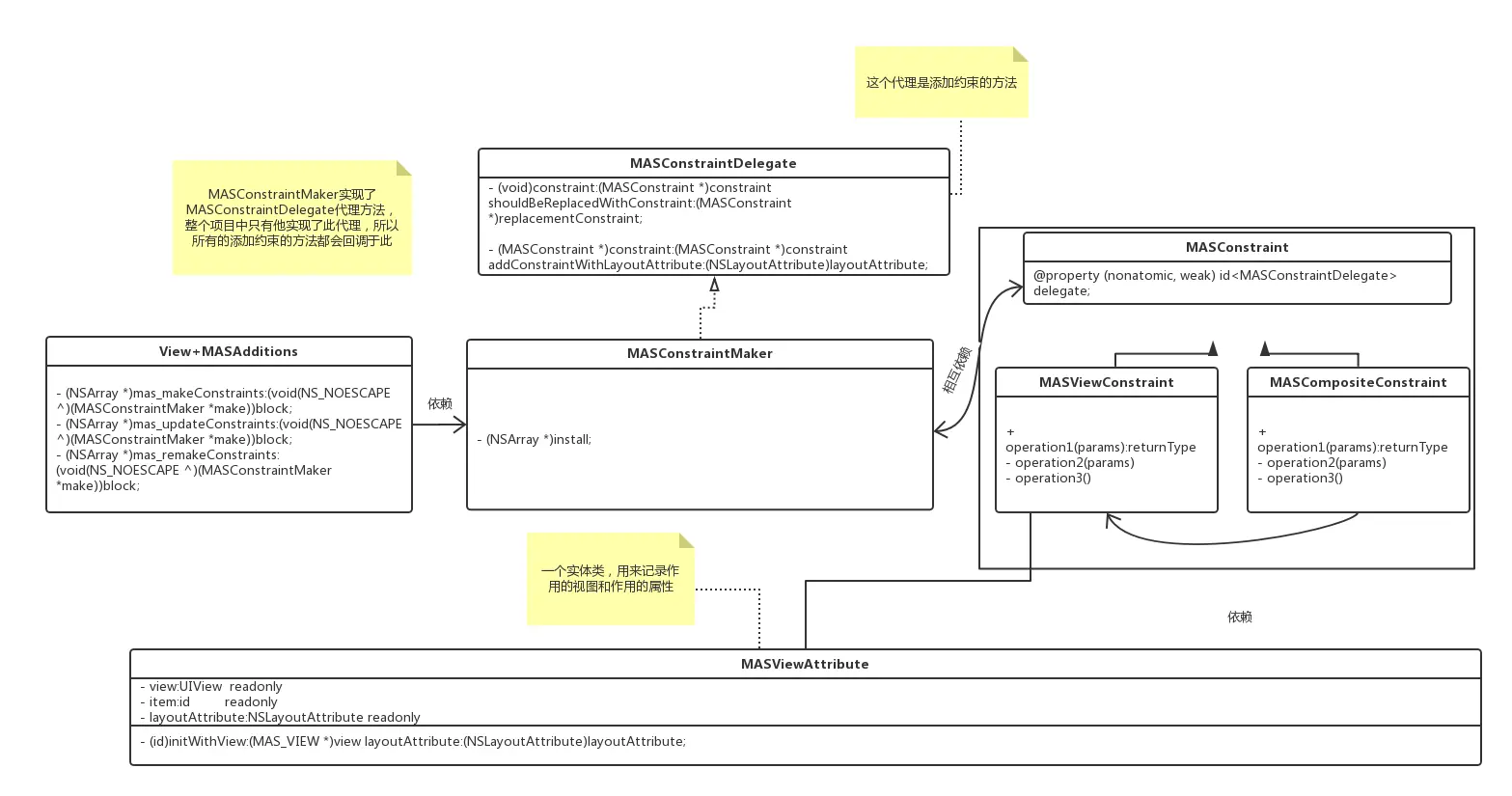 View+MASAdditions:第一层.提供最外层make、update、remake三个主要方法创建约束;并且提供了获取约束的方法。MASConstraintMaker:第二层。提供一个桥梁的作用,也是核心作用。我们生产的所有约束均存在此类的一个数组里。当调用install方法的时候,会循环遍历数组MASConstraint:第三层。这个是两个子类的父类,是Masonry约束的载体,并且拥有一个MASViewAttribute类的对象,用于存储苹果Autolayout的载体和真正作用的视图。